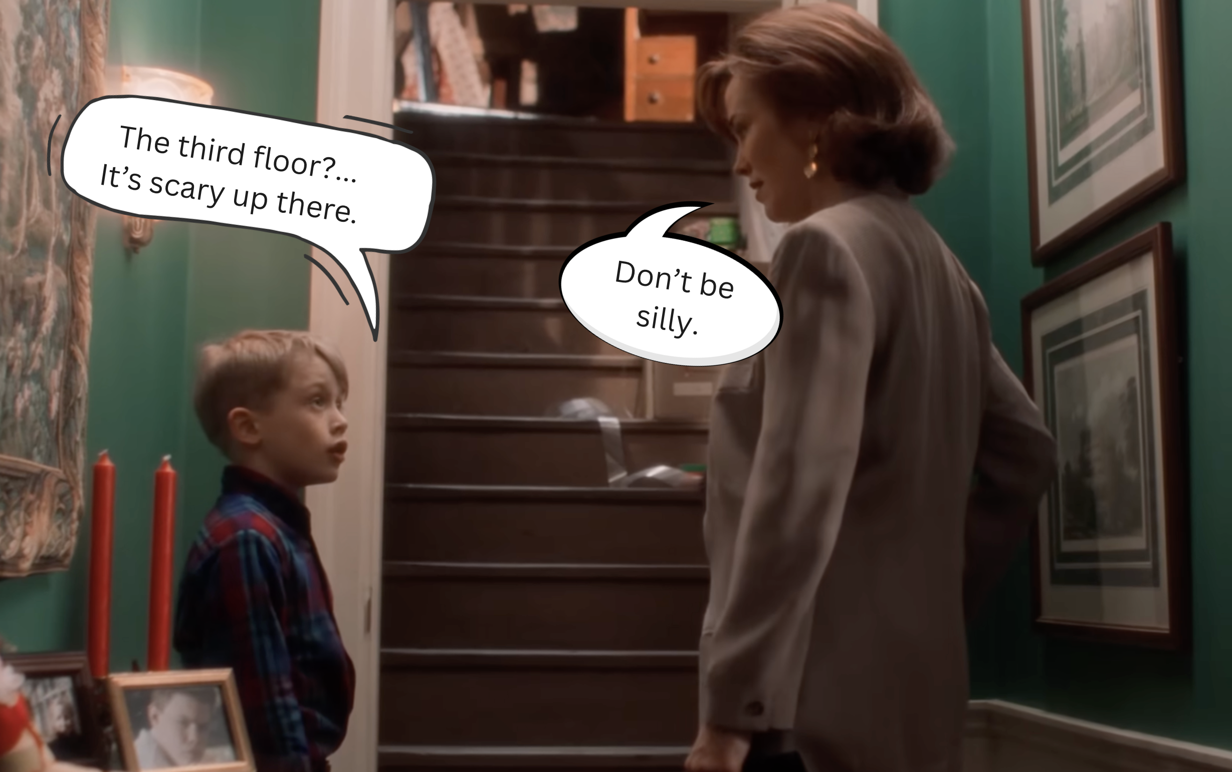 When he reveals his vulnerability, pleading with his mom, “It’s scary up there,” she gaslights him with, “don’t be silly.”