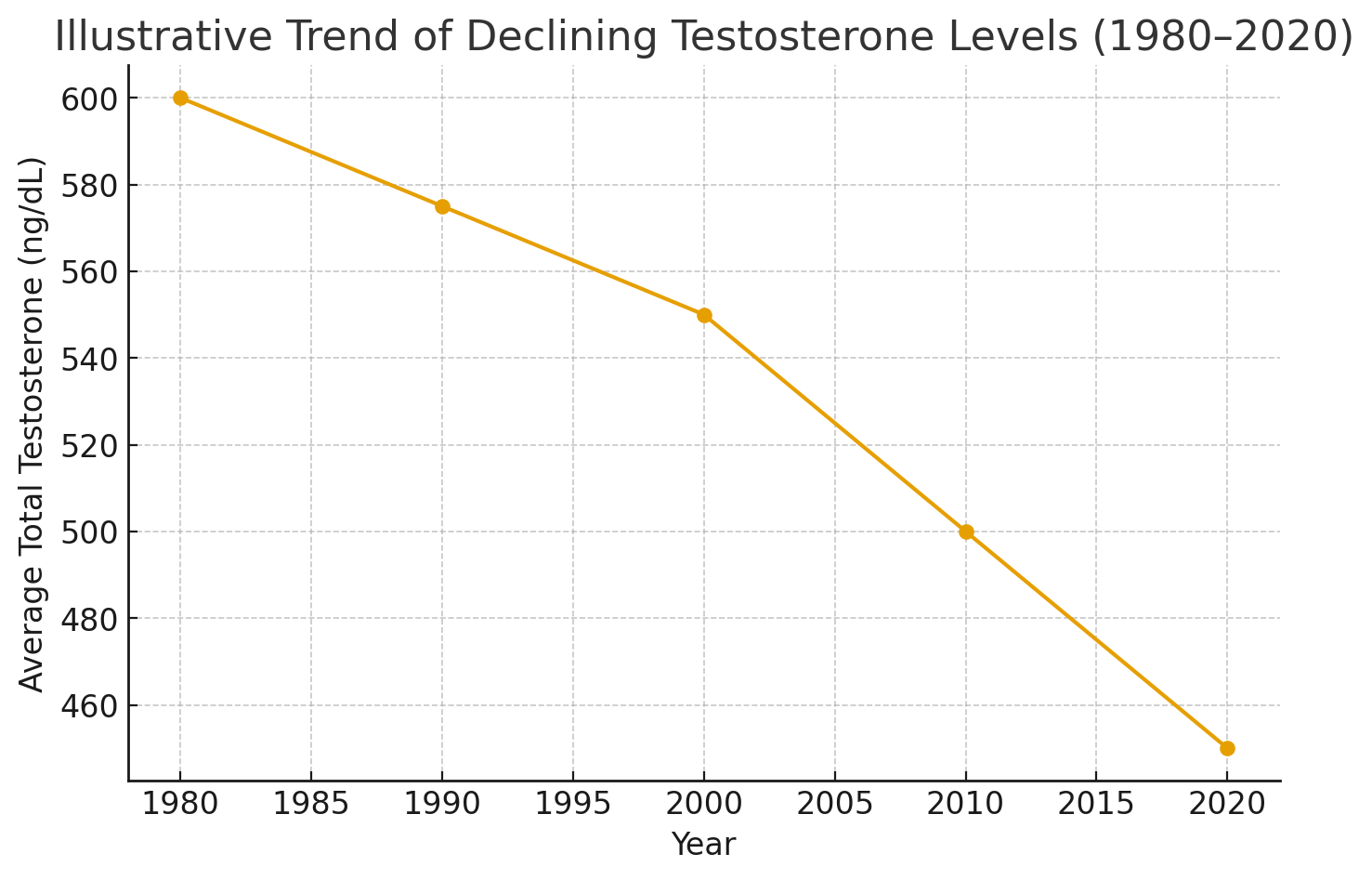 Over the past several decades, average testosterone levels in men have steadily declined, even when comparing men of the same age across generations.